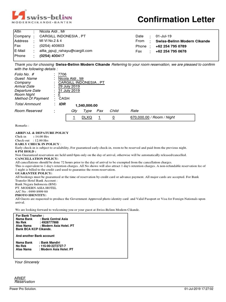 This Free Printable Reservation Confirmation Letter Can Be Used To Describe And Outline Hotel Room Policies Free To D Confirmation Letter Lettering Room Book