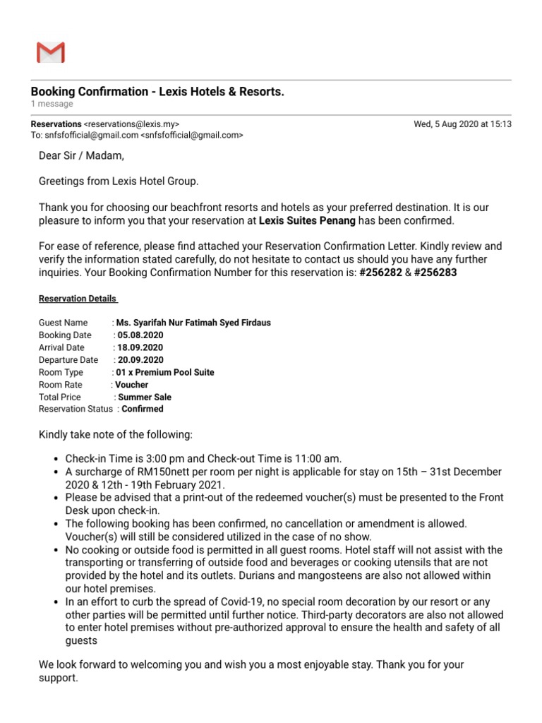Gmail Booking Confirmation Lexis Hotels Resorts 1 Hotel Service Industries
